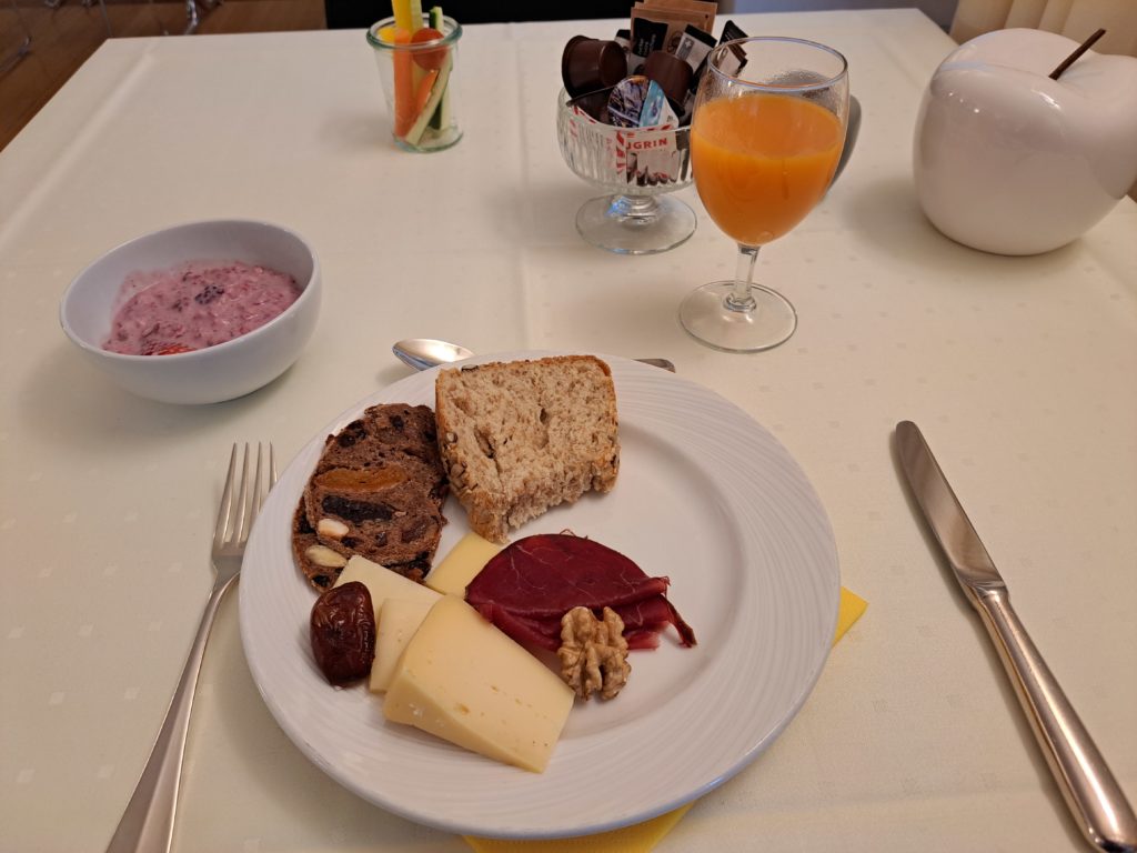 levé à 6h, je me prépare gentiment et déjeuner à 7h, un vrai buffet varié, avec des légumes, du pain aux abricots et autres production du cloître.