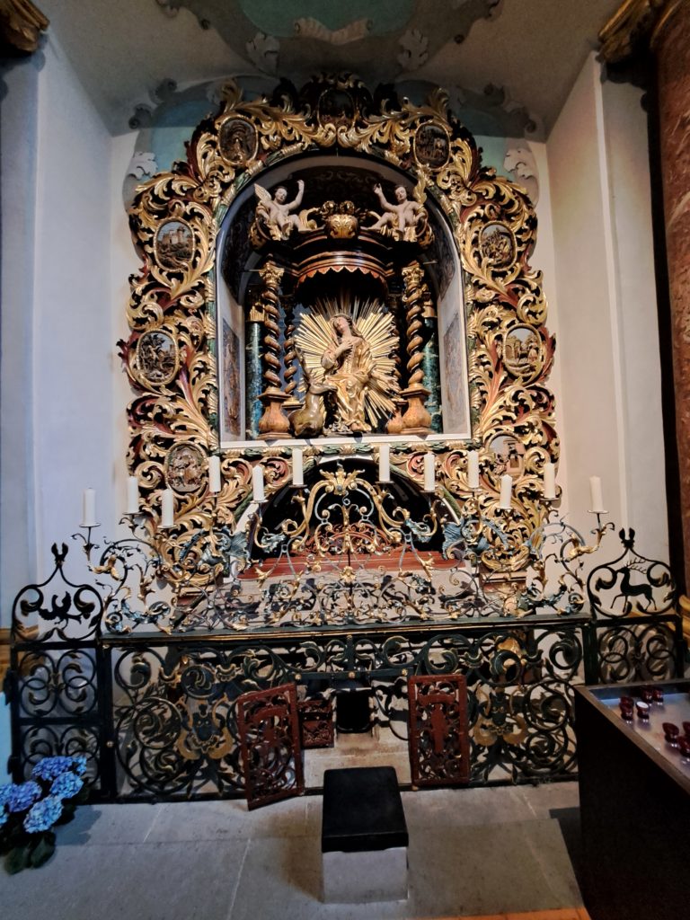un peu de protéines et de fromage, de l’énergie pour attaquer une belle montée, mais avant, j’ai droit à ma bénédiction du pèlerin privé, devant le tombeau de Sainte Ida, avant de plonger mes pieds sous le tombeau, comme le veut la coutume, pour qu’elle soigne mes pieds endoloris…