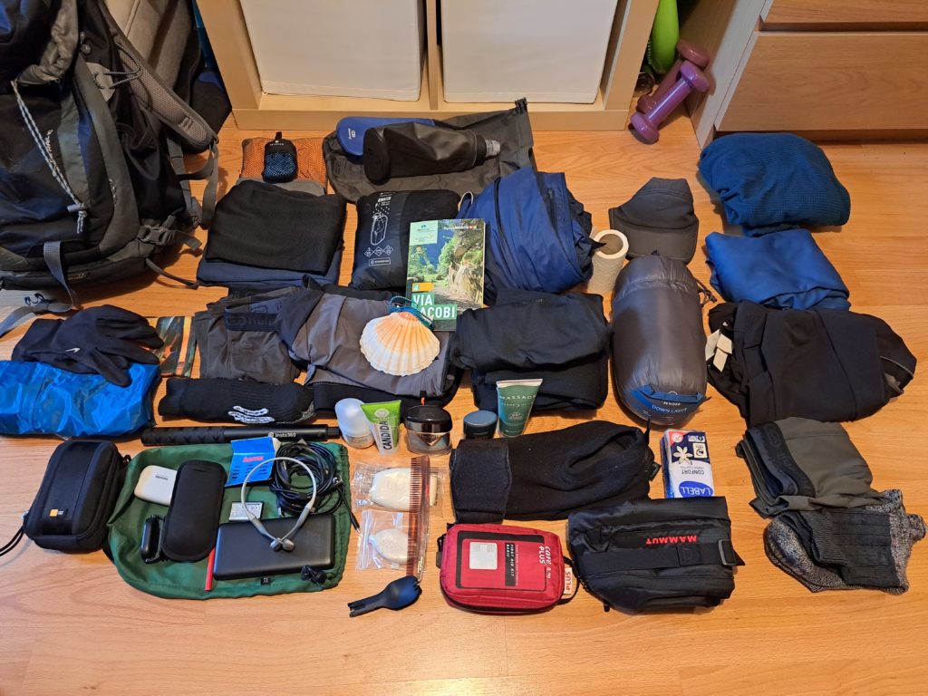 après avoir lu plein de forum, je prépare mon sac et me fixe un max de 7kg sans l’eau et la nourriture. On y es très vite, car il faut prendre les habits de rechange, les affaires pour la nuit, le sac de couchage. Commence alors le long jeu de tout peser et de négocier… quelles affaires seront les plus polyvalentes? Un short peu bien servir pour la nuit, la marche sous temps chaud et pour revenir de la douche! Et après plein de calculs, j’arrive pile à mes 7 kg, smartphone, chargeurs et appareil photo inclus.