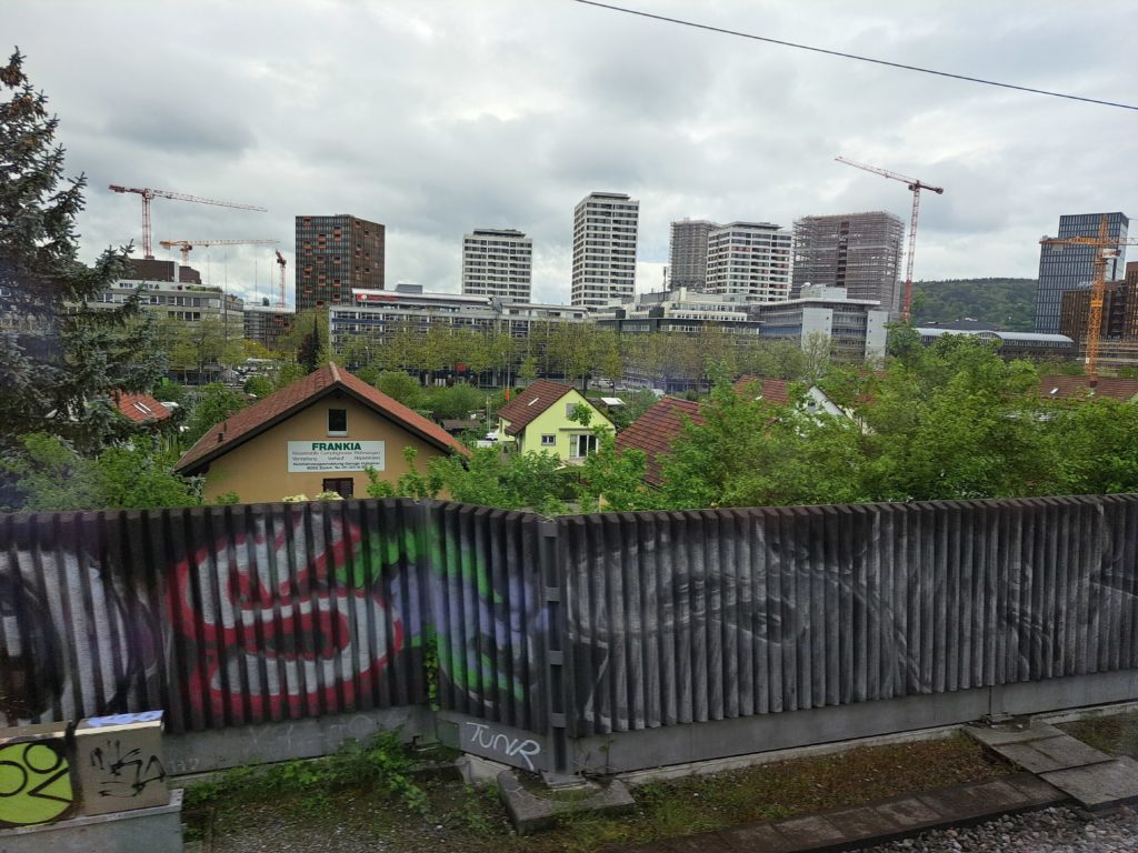 Parti de Chavornay sous une fine pluie, mon premier train est déjà en retard, ça commence bien. Le train est surchargé, je voyagerai debout. Arrivé à Yverdon, je retrouve un quai surchargé à son habitude, je vise le quai D, moins chargé selon l’application CFF. Mais sur le quai il y a plusieurs groupes d’ados et ils annoncent les voitures réservées… au secteur D. Je me place au C, trop de monde, je court à l’avant du train et je trouve une petite place dans un train bondé. Ouf.Arrivé à Zurich le train est en retard et traîne… j’arrive juste à temps pour voir le suivant me filer sous le nez!Heureusement, le suivant est 30′ plus tard et arrive 16′ après celui que j’aurais dû prendre. J’en profite pour acheter mon picnic, un petit sandwich et un mélange fromage-viande…