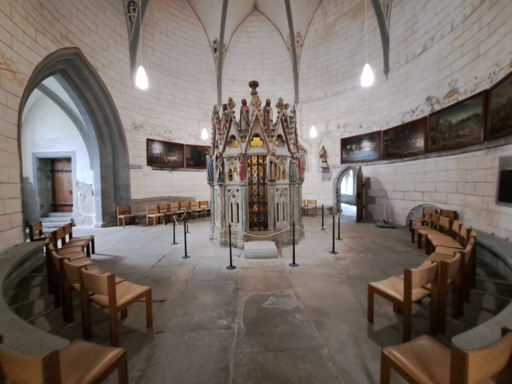 et finalement ça y est, je sort à Konstanz et visite la cathédrale, j’y trouve la rotonde de Saint-maurice, copie de l’église du saint- sépulcre de Jérusalem. Mais aussi une statue de Saint- Jacques, qui distribue des coquilles et des bâtons de pèlerin.